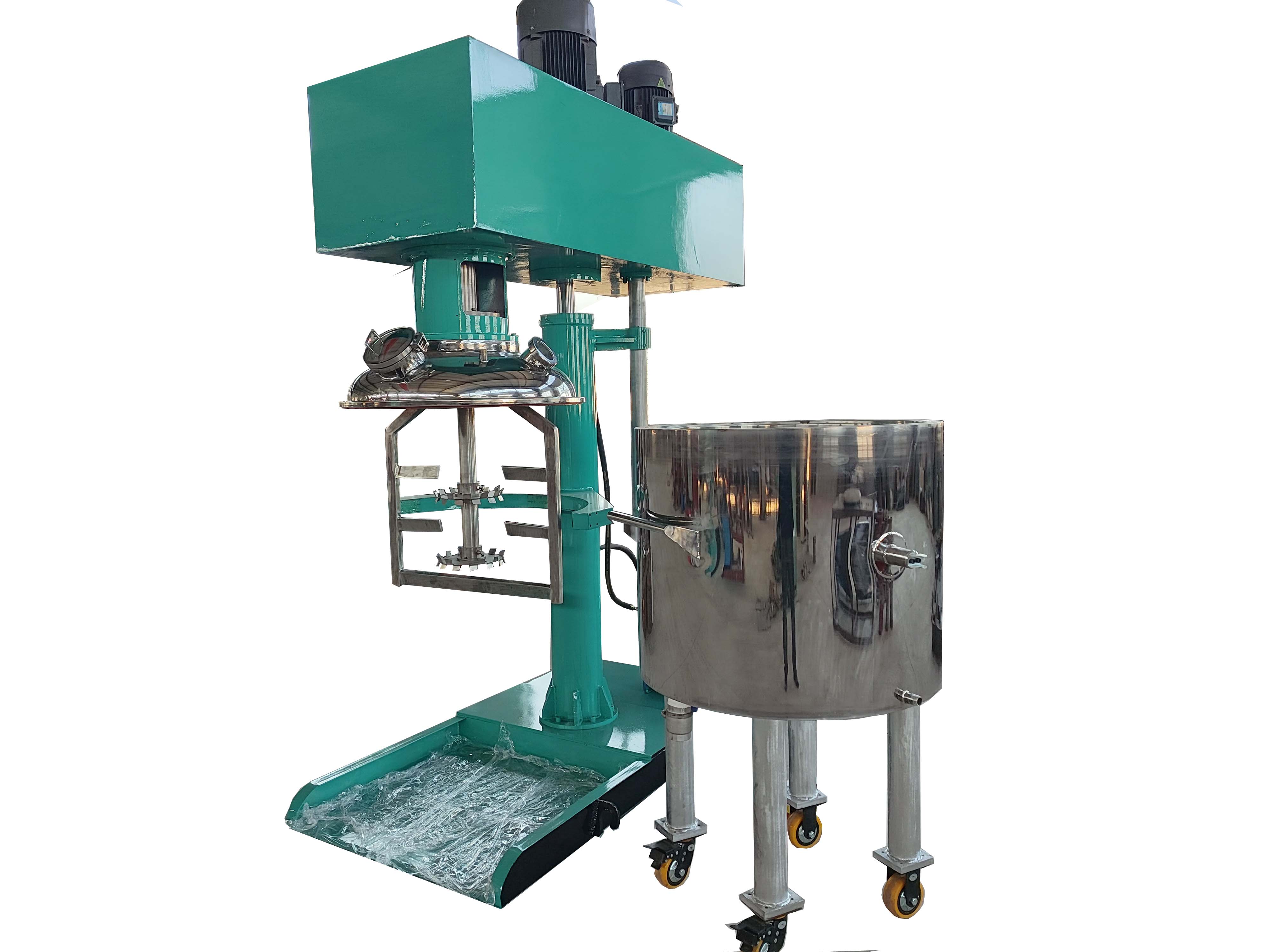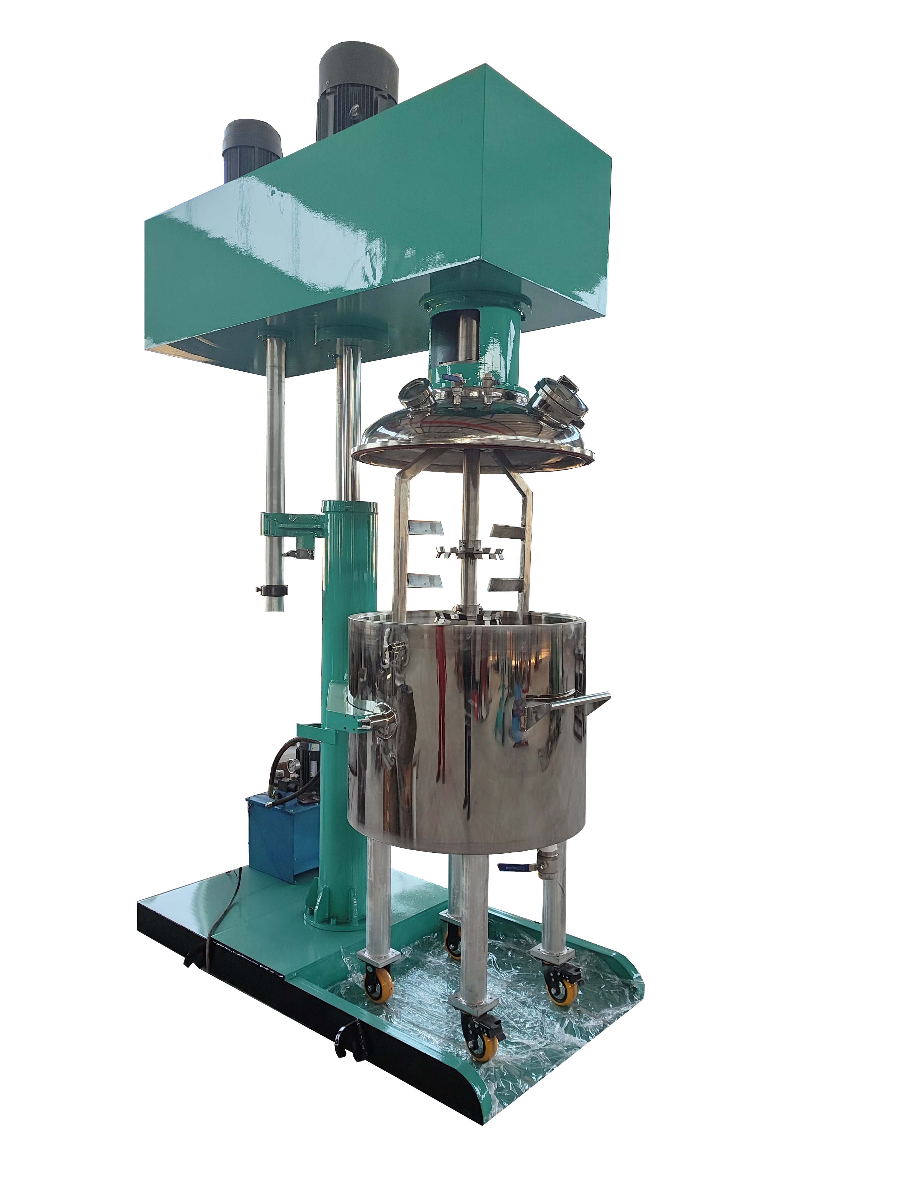 高、低速雙動(dòng)力設(shè)計(jì);匹配的動(dòng)能驅(qū)動(dòng)高速分散器高速旋轉(zhuǎn)使攪拌缸內(nèi)的液體物料呈現(xiàn)滾動(dòng)的環(huán)流,并產(chǎn)生-定范圍的旋渦,物料同時(shí)受到較強(qiáng)的剪切和沖擊,配合帶有活動(dòng)刮壁的低速攪拌器,把粘附在容器壁上的物料推向高速分散器的做功范圍,使兩種或兩種以上的物料很快得到分散、混合,使產(chǎn)品無色差、均勻度好、 透明度高??蚴綌嚢杵髦饕鉀Q拌合及物料粘壁問題,物料分散主要由中心分散器完成,從而各取所長,避其所短,使攪拌更快速,效率更高,混合更充分。根據(jù)工藝情況,高速實(shí)心軸與低速空心主軸間以及低速空心主軸與機(jī)架間均可安裝機(jī)械密封,從而實(shí)現(xiàn)真空作業(yè)。